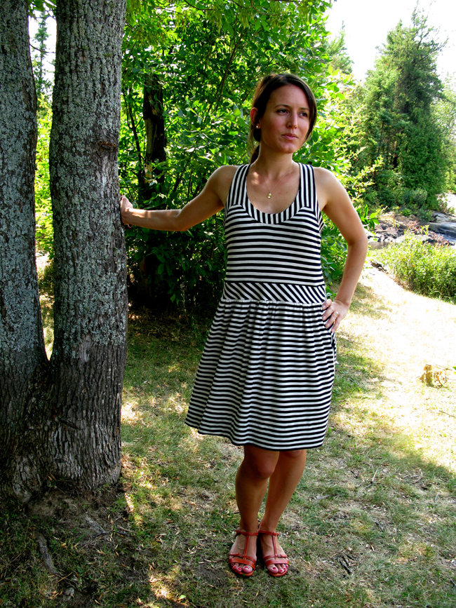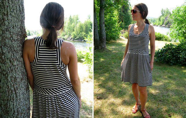 The stripes on this jersey didn't make the job any easier -- I think I sewed the bodice to the band with my eyes closed in fear -- but (magically!) the stripes lined up and I left my seam ripper in my sewing box.