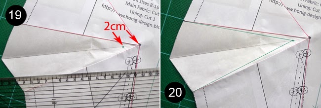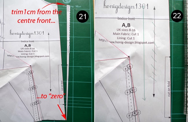 21) Measure in one centimetre from the centre front at the neckline and mark. Draw a long line from this point down the front of the to where the centre front meets the waist, or "zero". Trim along this line.