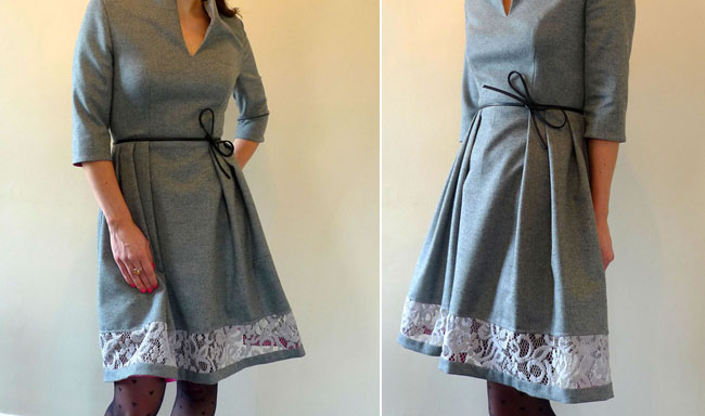 This time I've used a heavyish grey lace with a pink peek-a-boo band, and I moved the band down the skirt a touch (so there's not too much peeking-a-booing)...the result: same pattern, same main fabric but that bit dressier.