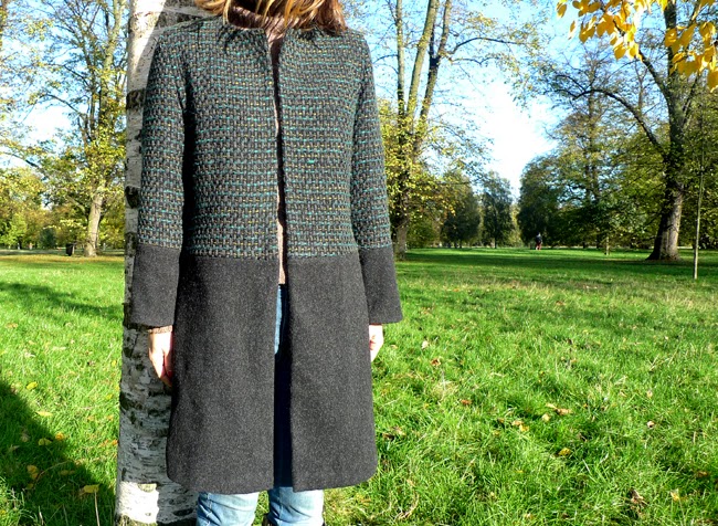 It's Burda's Collarless Open Coat, an easy and satisfying pattern to work with. I found the fabric for the top part of the coat in a remnant bin, for about £12. There was less than a metre to work with, so I had to split the pattern in two. I sourced the charcoal grey wool for the bottom from my local fabric store. With lining the whole thing cost me maybe £30 (I've seen similar collarless coats are selling in Zara for £89)